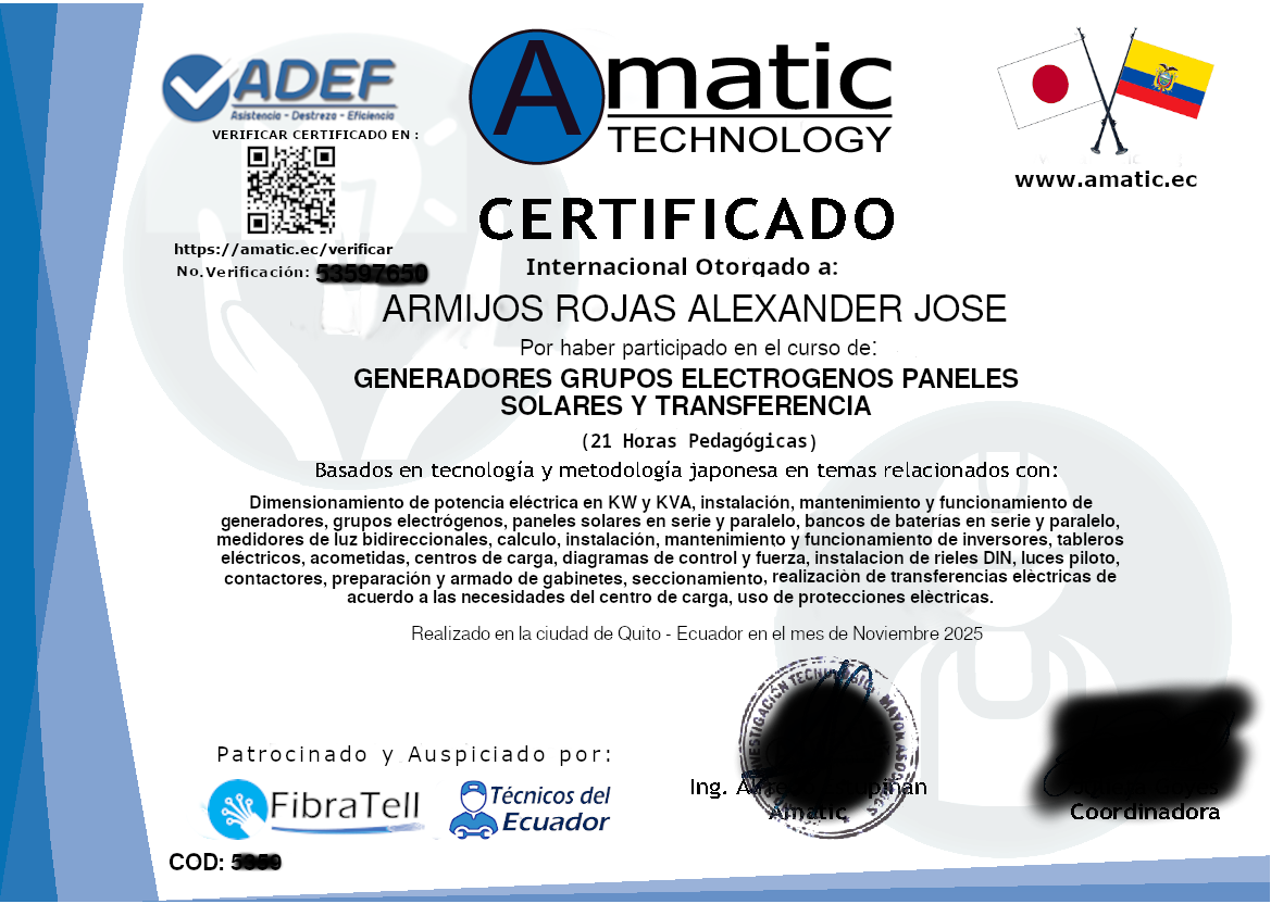 Se le otorgará su certificado, avalado y registrado por Amatic Technology, en nuestra plataforma web internacional, para que pueda validar o si gusta imprimir su certificado a nivel internacional.